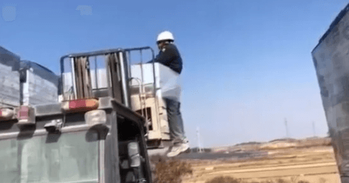 지게차가 움직이고, 그 끝에 줄에 묶인 한 사람이 매달려 있습니다.